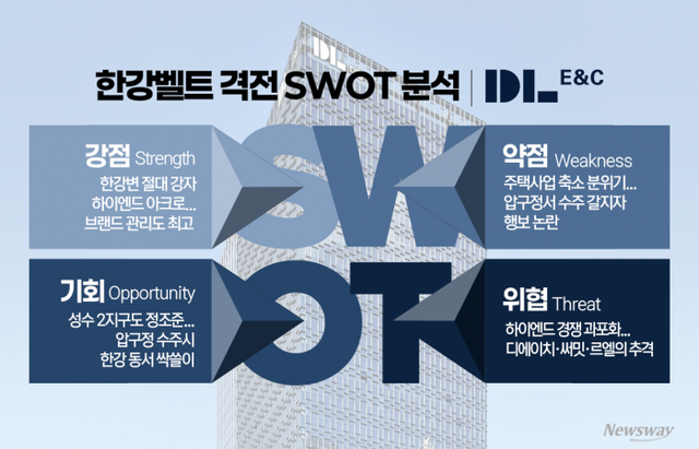 뉴스웨이는 한강벨트 격전지 분석 4편에서 DL이앤씨의 이러한 전략적 우회와 조직 및 내부 사업 전략을 감안해 SWOT 분석을 통해 '아크로'가 그리는 하이엔드 제국의 실체와 그 이면을 심층 분석했다.
