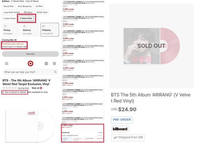 [스포츠동아 양형모 기자] “재입고 알림? 소용없다.” 방탄소년단 뷔 LP ‘VELVET RED’가 미국·일본·한국에서 연속 품절을 기록하며 팬들의 화력을 다시 보여줬다.