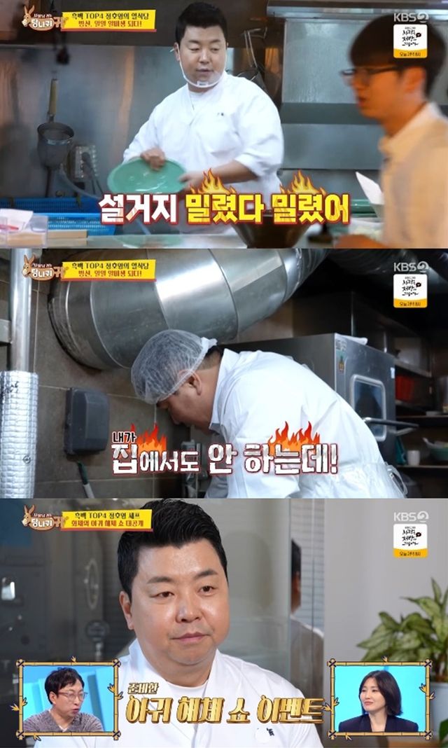정호영은 양준혁을 향한 손님들의 관심이 커지자 홀에 있던 양준혁을 불러 이제 설거지를 해 달라고 했다.