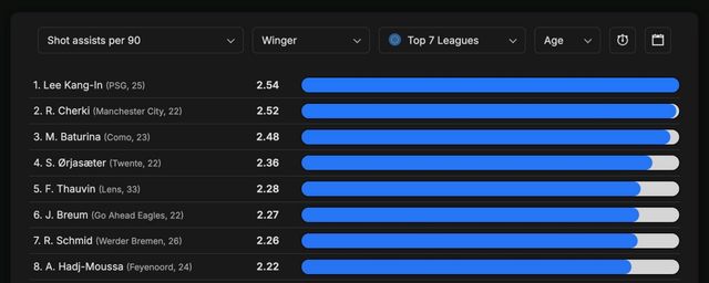 이강인은 2025-2026시즌 90분당 슈팅 어시스트 개수에서 2.54개로 유럽 전체 1위에 올랐다. 2위인 라얀 셰르키(맨체스터 시티)의 2.52개를 근소하게 앞질렀다.