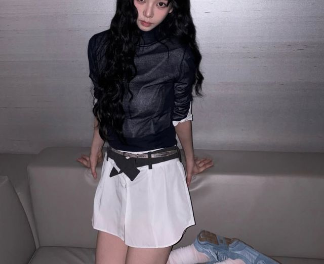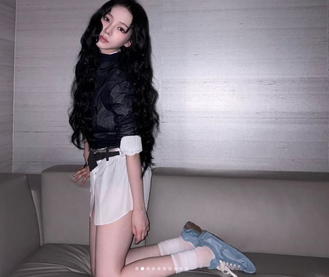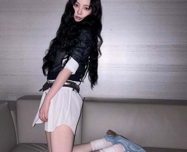 셔츠 레이어드로 완성한 ‘역대급’ 하의실종 패션이 시선을 끈다. 카리나는 화이트 셔츠 위에 짙은 네이비 톤의 시스루 상의를 레이어드하고, 얇은 벨트로 허리 라인을 강조했다. 셔츠 밑으로 드러난 각선미는 소위 ‘하의실종’ 패션의 정석을 보여줬다. 자칫 밋밋할 수 있는 룩에 하늘색 스니커즈와 화이트 삭스를 매치해 스포티하면서도 러블리한 매력을 더했다.