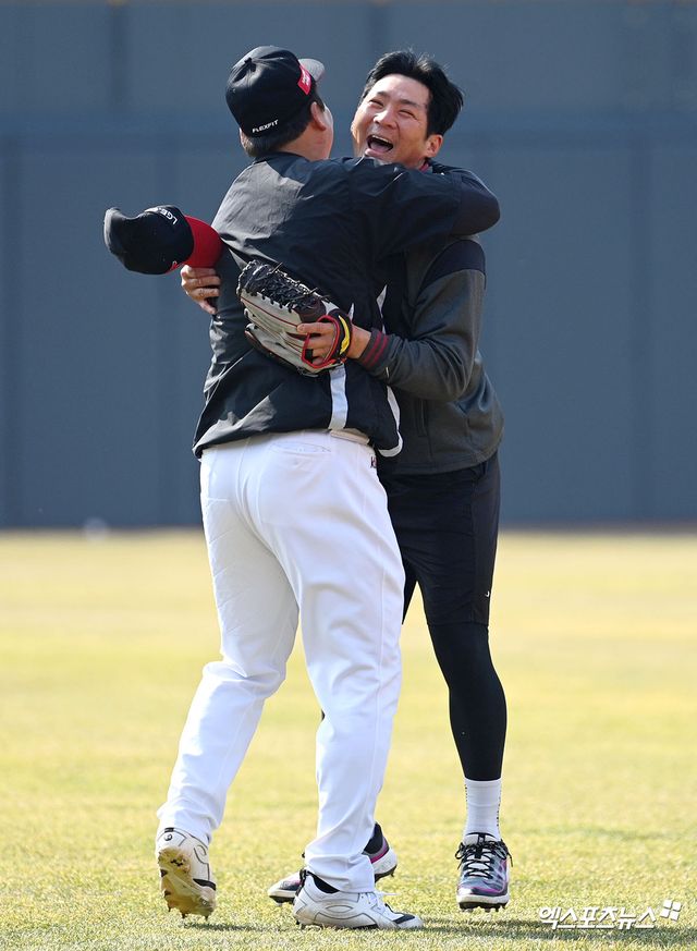 (엑스포츠뉴스 수원, 고아라 기자) 16일 오후 수원KT위즈파크에서 열리는 ‘2026 신한 SOL KBO리그’ LG 트윈스와 KT 위즈의 시범경기, KT 김현수 LG 오지환이 인사를 하고 있다.