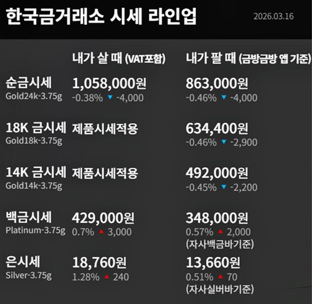 국내 금시세(금값)가 16일(한국 시각) 오후 하락세(전 거래일 대비)를 보이고 있다.