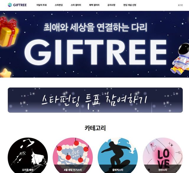 기프트리는 포털에서 ‘기프트리’를 검색하면 접속할 수 있으며 네이버·카카오 아이디로 누구나 간편하게 가입할 수 있다. 기사 읽기, 광고 보기 등 간단한 미션을 수행하면 하루 최대 72장의 투표권을 받을 수 있으며 로그인만 해도 매일 2장의 투표권이 지급된다. 획득한 투표권은 원하는 스타에게 자유롭게 사용할 수 있다.