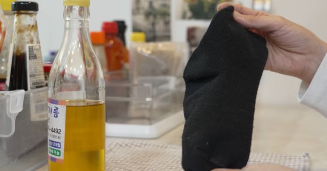 그래서 들기름은 직사광선을 피하고 서늘한 곳에 보관하는 것이 기본이다. 하지만 주방에 두고 사용하는 경우 창가나 형광등 아래에 놓이기 쉬워 빛에 노출되는 일이 생각보다 많다. 이때 양말을 활용하면 간단하게 빛 차단 효과를 얻을 수 있다.