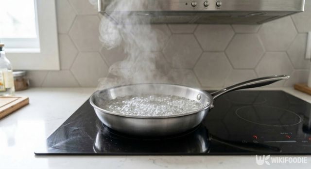 5분 정도 끓이면 물을 버리는데, 이때 주의할 점이 있다. 팬이 뜨거운 상태에서 바로 찬물로 헹구면 팬 표면이 손상될 수 있다. 따라서 물을 버린 뒤에는 그대로 둬 자연스럽게 식히는 것이 좋다. 팬에 남은 물기는 마르도록 두거나 키친타월로 닦아 완전히 제거한다. 물기가 남아 있으면 이후 과정에서 기름이 고르게 퍼지지 않을 수 있다.