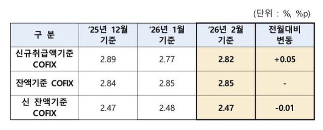 반면 지난달 신 잔액 기준 코픽스는 2.47%로 전월 대비 0.01%p 소폭 하락했고, 잔액 기준 코픽스는 전월(2.85%) 수준을 유지했다.
