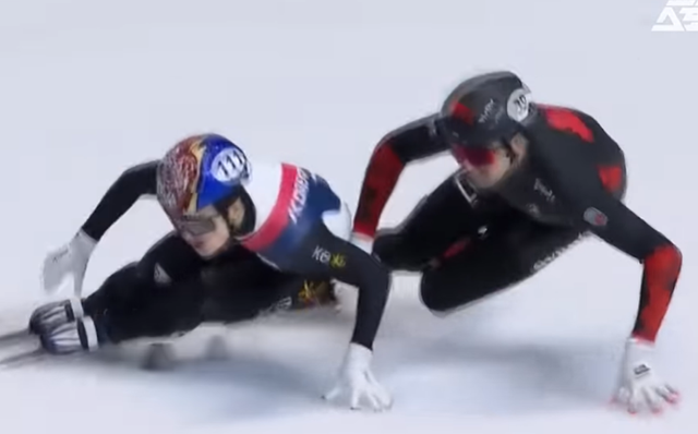 그러자 이정민도 다 잡은 우승을 놓칠 것 같은 본능이 나온 듯 라운을 왼팔로 견제했고, 결승선 통과 시점에서 이정민은 균형을 유지해 오른쪽 스케이트날을 쭉 내밀었다. 반면 라운은 넘어지면서 결승선을 통과했다.