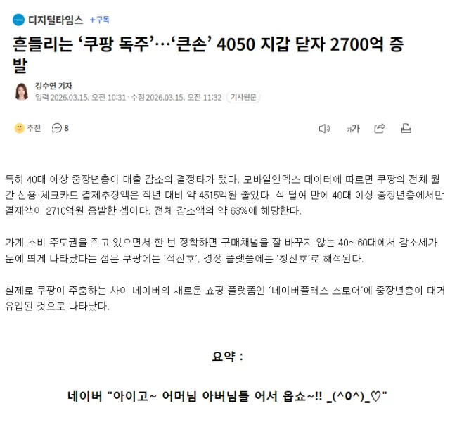 흔들리는 ‘쿠팡 독주’… ‘큰손’ 4050 지갑 닫자 2700억 증발 | 디지털타임스