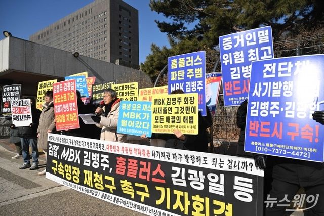 이의환 홈플러스 물품구매전단채 피해자 비상대책위원회 집행위원장이 27일 오전 서울 서초구 서울중앙지방검찰청 정문 앞에서 열린 김병주 MBK 회장-김광일 홈플러스 공동 대표 겸 MBK 부회장 등에 대한 구속영장 재청구 촉구 기자회견에서 발언을 하고 있다. 사진=강민석 기자 kms@newsway.co.kr