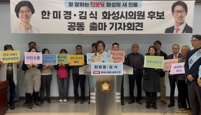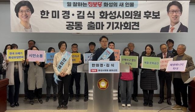 [와이뉴스] 진보당 한미경(가선거구)·김식(마선거구) 화성시의원 예비후보가 앞선 12일 오후 화성시의회 대회의실에서 공동 출마 기자회견을 열고 본격적인 선거 행보를 선언했다. 이날 회견에는 노동계, 학부모, 시민사회를 대표하는 지지자들이 참석해 두 후보의 당선을 위해 힘을 모았다.