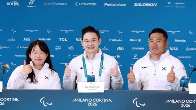 대한장애인노르딕스키연맹은 15일(현지시간) 이탈리아 테세로 크로스컨트리 스타디움에서 기자회견을 열었다. 연맹 배동현 회장과 김윤지-신의현이 자리했다.