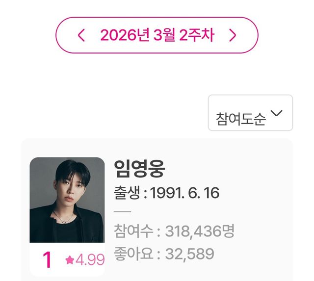16일 아이돌차트에 따르면 임영웅은 3월 9일부터 3월 15일까지 집계된 3월 2주차 평점랭킹에서 31만8436표를 얻어 최다 득표를 기록했다.