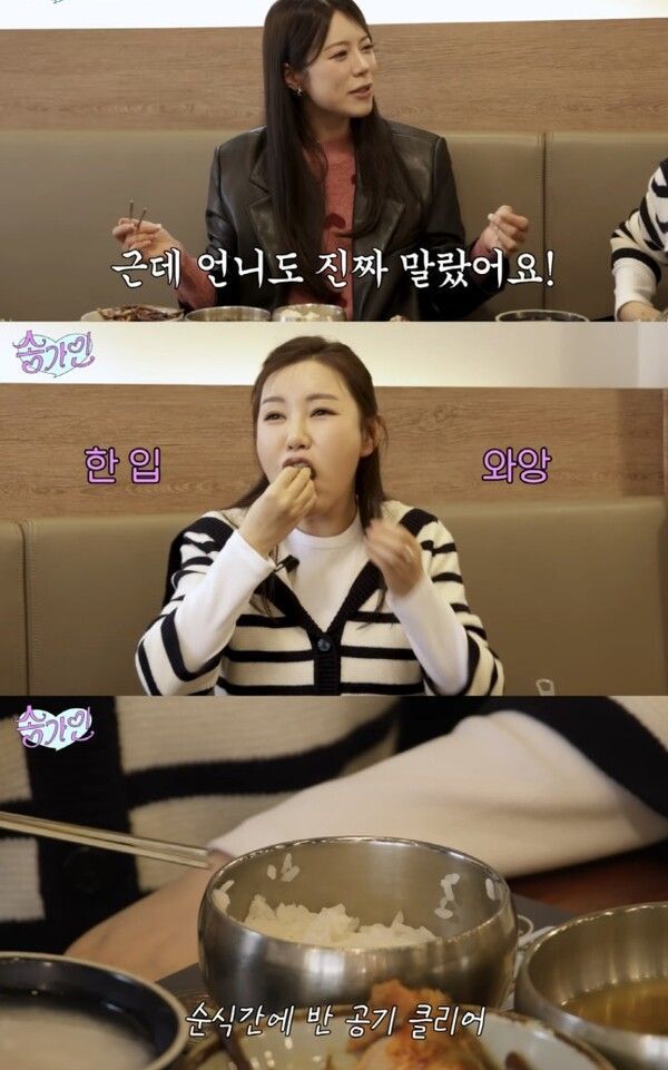 식사 도중 양지은이 소식좌라고 말하자 송가인은 양지은을 향해 뼈밖에 없다며 아기 엄마라는 게 믿기지 않는 몸매라고 농담 섞인 분노를 표해 웃음을 자아냈다. 이어 송가인은 나는 아기도 안 낳았는데 왜 살이 찌는지 모르겠다며 망언 아닌 망언을 던졌고, 이에 양지은은 언니도 정말 말랐다며 훈훈한 분위기를 이어갔다.