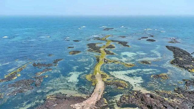 ‘떠오르길’이라 불리는 이 길은 평소에는 바닷속에 잠겨 있다가 간조가 되면 서서히 수면 위로 모습을 드러낸다. 바다가 숨겨두었던 길을 따라 걷는 경험은 제주 여행에서 만날 수 있는 가장 신비로운 순간 가운데 하나로 꼽힌다. 길게 뻗은 길 위로 초록빛 이끼와 해조류가 융단처럼 깔려 있어, 마치 바다 한가운데를 가로질러 걷는 듯한 비현실적인 분위기를 자아낸다.