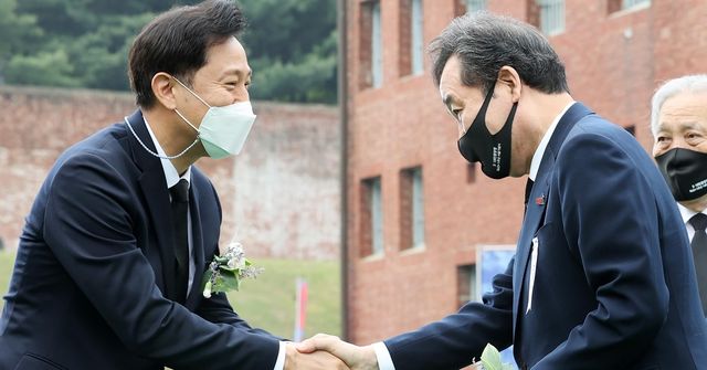 2021년 5월 18일 오세훈 서울시장과 이낙연 전 더불어민주당 대표가 서울 서대문형무소 역사관에서 열린 5·18민중항쟁 제40+1주년 서울기념식에 참석해 인사를 나누고 있다. / 뉴스1