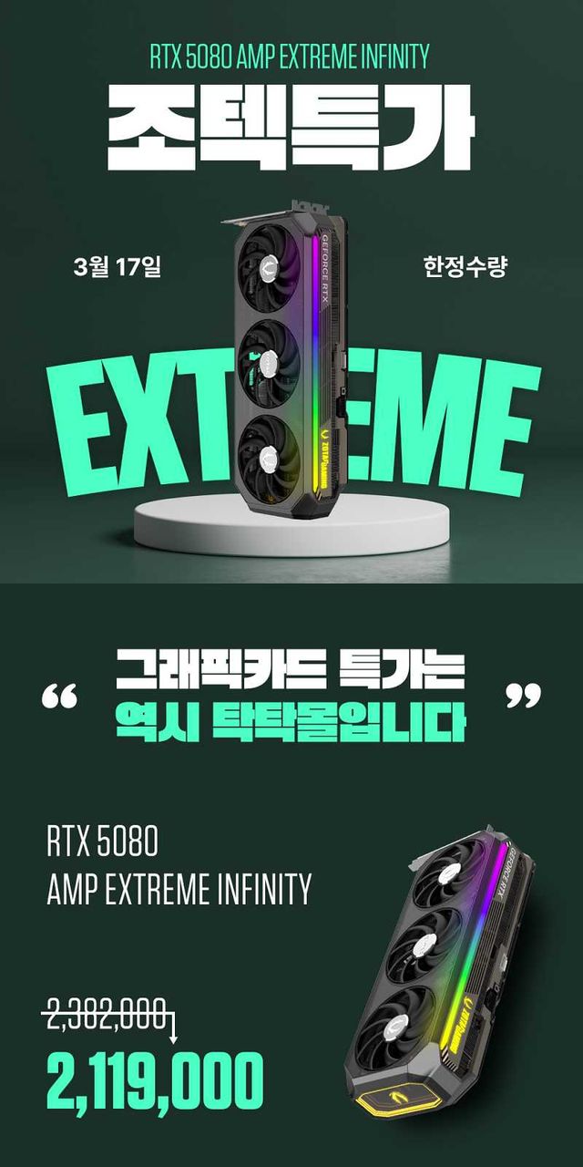 조텍코리아가 지포스 RTX 5080 그래픽카드 특가를 진행한다. 행사 제품은 ZOTAC GAMING 지포스 RTX 5080 AMP Extreme Infinity로, 탁탁몰에서 한정 수량으로 판매된다.
