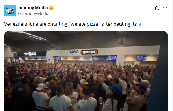 앞서 8강에서 일본을 꺾은 뒤 대표팀 간판 타자 로날드 아쿠냐 주니어가 남긴 '스시 발언'이 논쟁을 일으킨 데 이어, 이번에는 베네수엘라 팬들이 "우리는 피자를 먹었다"를 연호하며 상대 팀 이탈리아를 겨냥한 듯한 장면이 포착돼 주목받고 있다.