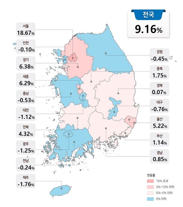 전국 평균 공동주택 공시가격은 9.16% 상승했다. 이보다 높게 상승한 시도는 서울(18.67%)이 유일했다. 서울을 제외한 지역의 가격은 3.37% 올랐는데, 전년(1.18%)을 웃도는 상승률이다.
