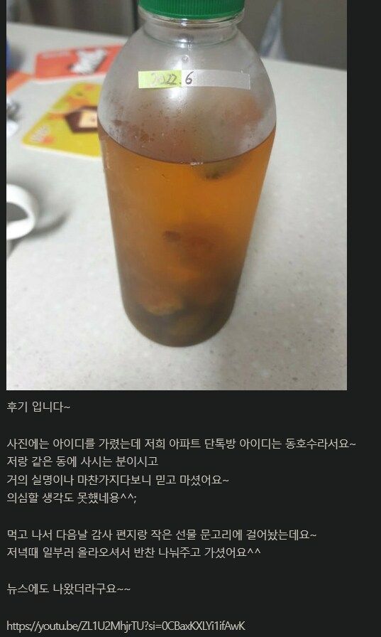 - 통 큰 나눔: 한 잔만 부탁했던 작성자의 기대와 달리, 이웃은 직접 담근 매실 원액을 페트병 한 가득 담아 건넸습니다.