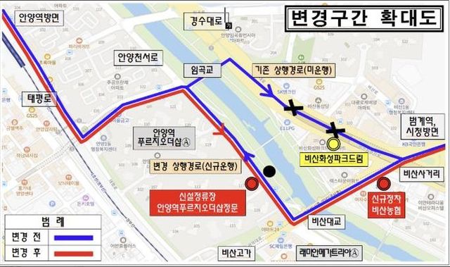 핵심 변경 구간은 안양1동 행정복지센터에서 비산사거리로 이어지는 안양천서로 경로다.