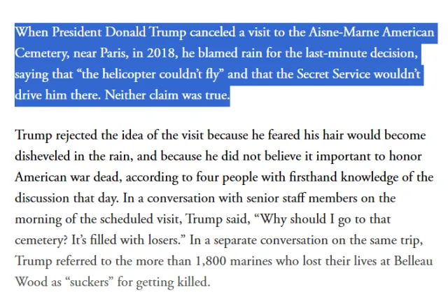 미군 참전용사들이 있는 프랑스의 Aisne-Marne 묘지에 가기 싫다고 땡깡치면서