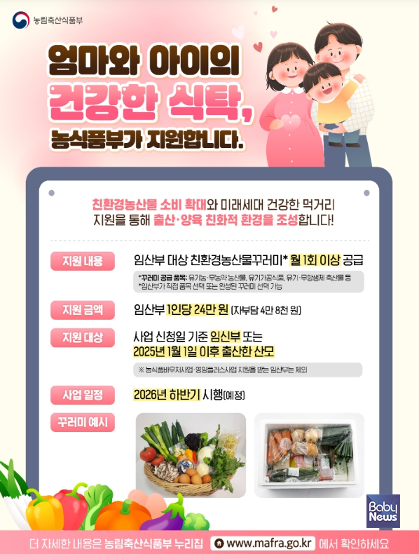 올해는 전국 임산부 16만 명을 대상으로 24만 원 상당의 온라인몰 포인트를 지원할 예정이다. 선정된 임산부는 꾸러미 주문 금액의 80%를 포인트로 결제할 수 있다.