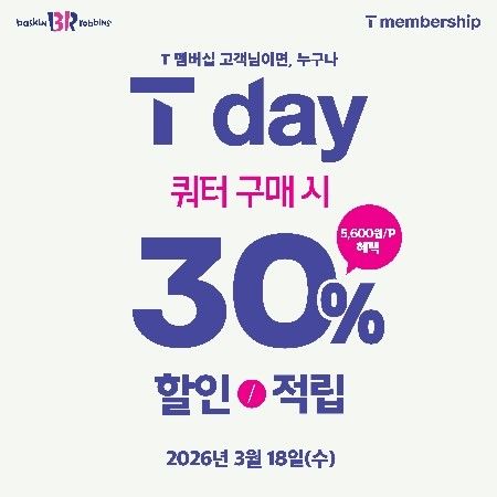 배스킨라빈스는 이날 SK텔레콤 고객을 대상으로 'T day' 프로모션을 진행한다.