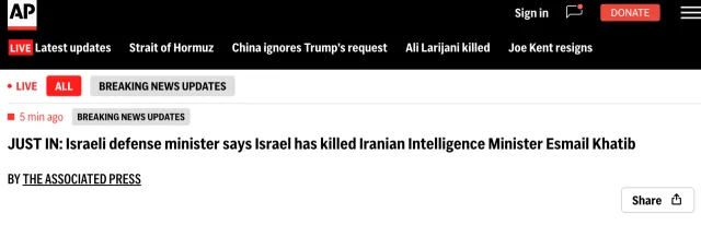 이스라엘 카츠(Israel Katz) 국방부 장관은 수요일, 이란의 정보부 장관 에스마일 카팁(Esmail Khatib)을 사살했다고 발표했습니다. 이번 작전은 이란의 고위 안보 책임자 알리 라리자니와 혁명수비대 산하 바시지 민병대 지휘관이 잇따라 사살된 뒤 이루어진 후속 조치입니다.