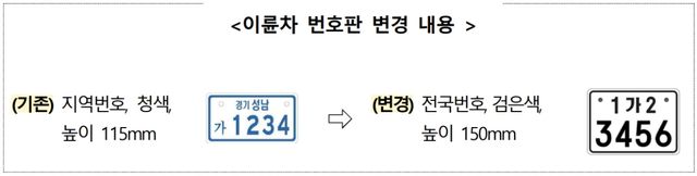 번호판 크기도 확대된다. 기존 210㎜·115㎜에서 210㎜·150㎜로 세로 길이가 늘어나 전체 면적이 약 30% 커진다. 색상은 흰색 바탕에 청색 글씨에서 검은색 글씨로 변경된다. 이를 통해 시인성을 높이고 무인 단속 장비의 인식률을 끌어올린다는 계획이다.