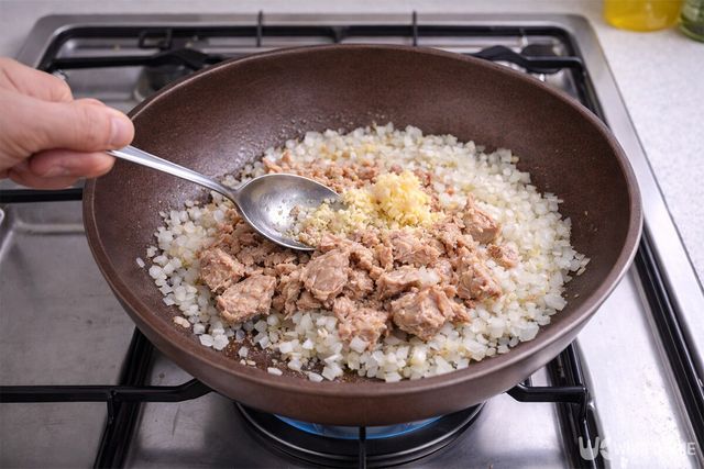2. 팬에 참치, 다진 양파, 다진 마늘을 넣고 중불에서 볶는다.