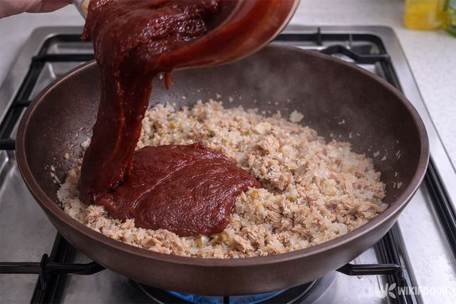 재료의 수분이 거의 사라지면 고추장 2컵을 넣는다. 참치 200g당 고추장 1컵 비율로 맞추면 간이 적당하다. 고추장을 넣은 뒤에는 불을 약하게 줄여야 한다. 고추장은 당분이 많아 금방 타버리기 때문이다.