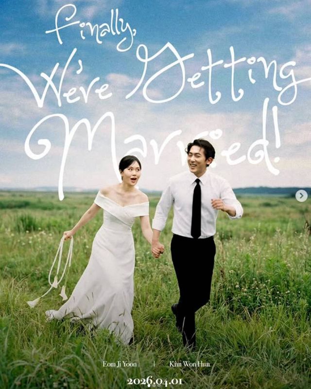 턱시도를 입은 김원훈과 드레스를 입은 엄지윤은 다정한 예비 부부의 모습을 하고 있다. '봄바람이 스미는 날, 결혼합니다'라는 문구와 날짜와 강남구 웨딩홀이라는 장소가 적혀 더욱 놀라움을 안겼다.