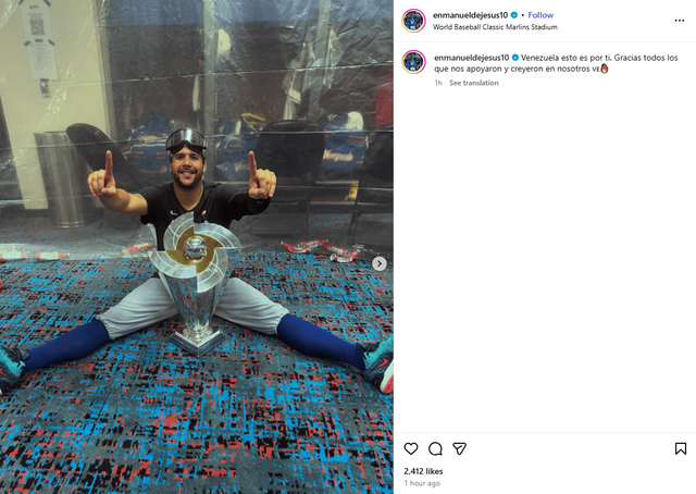 헤이수스는 19일(한국시간) 자신의 사회관계망서비스(SNS) 인스타그램에 우승 트로피와 자신의 모습을 담은 사진을 올리며 "베네수엘라, 이건 당신들을 위한 것이다. 우리를 지지하고 믿어준 모두에게 감사하다"라고 적었다. 이 게시물은 곧바로 해외 팬들 사이에서 확산되며 그의 스토리와 함께 재조명되고 있다.