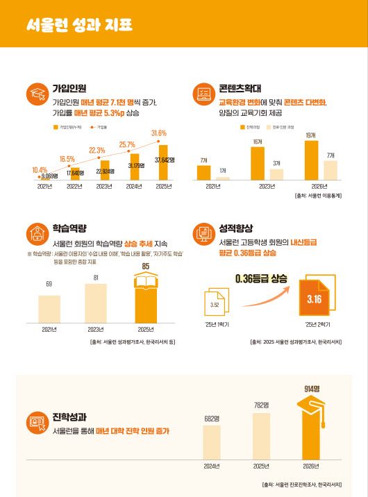 아울러 서울런 이용 가구 중 사교육비가 줄었다고 답한 비율은 지난해 61.3%로 1년 전보다 8.9%포인트 올랐다. 월평균 절감액은 2023년 25만 6000원에서 2025년 34만원으로 늘었다.