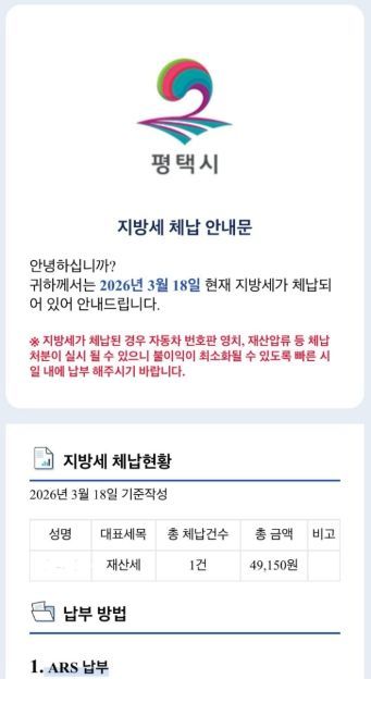 [와이뉴스] 평택시는 ‘모바일 전자고지 시스템’을 활용해 지방세 체납자 1만7천여 명을 대상으로 오는 23일과 24일 이틀 동안 전자문서 형태의 체납안내문을 발송할 예정이다.