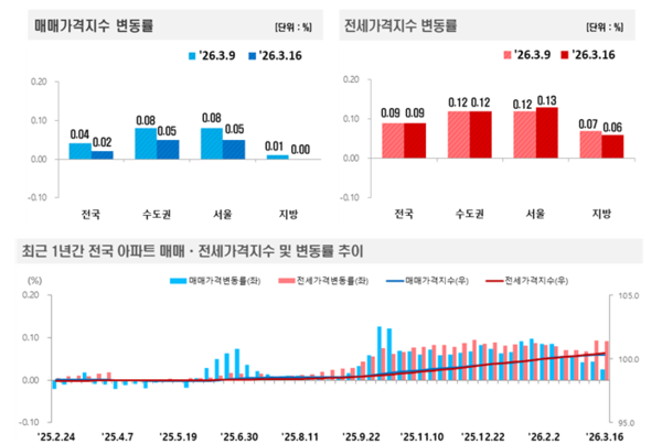같은 기간 전국 아파트 매매 가격은 0.02% 오르며 전주 대비 상승폭이 0.02% 포인트 내렸다.