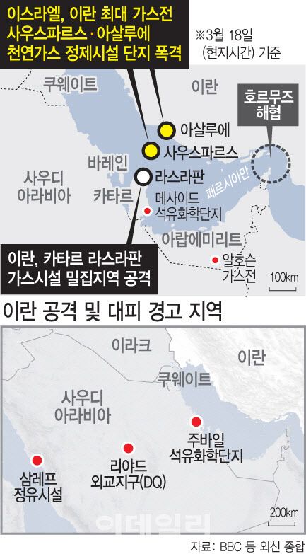 로이터통신 등에 따르면 이날 이란 최대 가스전인 사우스 파르스와 이와 직결된 이란 남서부 해안 아살루예의 천연가스 정제시설 단지가 이스라엘의 미사일 폭격을 받았다. 사우스 파르스 가스전 일부 광구가 화재로 가동이 중단됐고 가스 저장 탱크와 정유시설 일부도 타격을 입었다. 이후 이란은 카타르의 주요 가스 시설을 두 차례 공격하고 사우디 수도 리야드를 향해 미사일을 발사했다. 카타르 국영 석유기업 카타르에너지는 에너지 산업의 중심지인 라스라판 산업도시가 이란 미사일 공격을 받아 “광범위한 피해”가 발생했다고 밝혔다.
