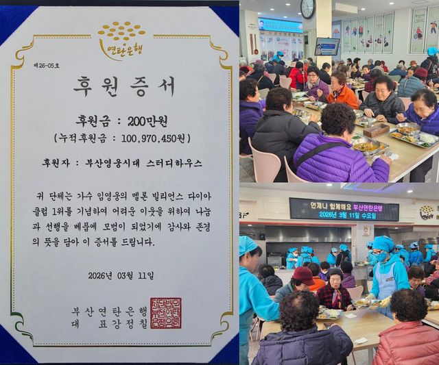 (엑스포츠뉴스 이정범 기자) 임영웅 팬클럽 '부산영웅시대 스터디하우스'가 누적 기부금 1억 원을 달성했다.