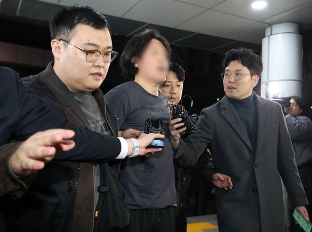 부산의 한 아파트에서 항공사 기장을 흉기로 살해한 혐의를 받는 50대 피의자가 17일 오후 부산진경찰서로 압송되고 있다. 피의자는 전 직장 동료인 국내 항공사 50대 기장을 살해한 후 울산의 한 모텔에 숨어있다가 경찰에 붙잡혔다. / 뉴스1