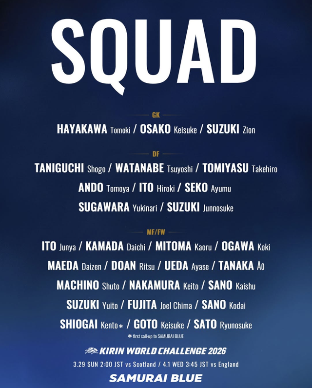 일본은 대표팀의 주장 엔도 와타루를 비롯해 공격의 핵심인 구보 다케후사, 지난해 브라질을 상대로 골을 터트렸던 미나미노, 주축 수비수 이타쿠라 고 등이 부상으로 이번 소집에서 제외됐다. 일본은 주요 선수들이 빠진 채 스코틀랜드, 잉글랜드와 친선경기를 치른다.
