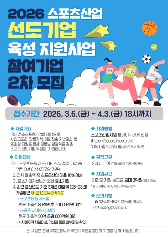 (엑스포츠뉴스 권동환 기자) 서울올림픽기념국민체육진흥공단(이하 국민체육진흥공단)이 문화체육관광부와 함께 국내 중소 스포츠 기업의 국제 경쟁력 강화를 위해 추진 중인 '2026 스포츠산업 선도기업 육성 지원 사업'에 참여할 기업을 추가로 모집한다.