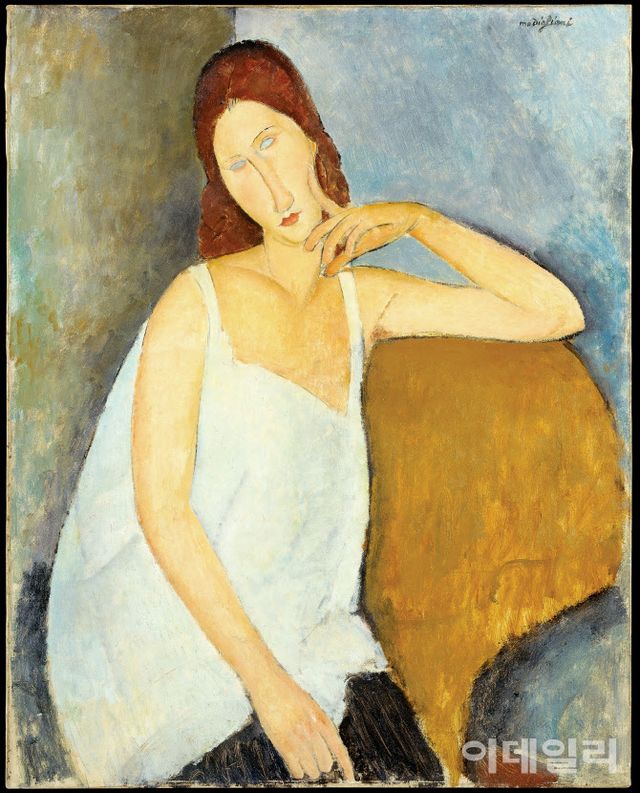 그렇다면 모딜리아니가 생애 가장 뜨겁게 사랑했던 연인이자 동지를 그린 ‘잔 에뷔테른의 초상’(1918)은 또 어떨까. 모딜리아니가 남긴 수많은 에뷔테른의 초상 중에서도 유독 흰옷이 도드라진 작품은 특유의 정형화된 양식미가 절정에 달해 있다. 하얀 옷을 입고 의자에 비스듬히 앉아 있는 에뷔테른은 시리도록 푸른 눈을 가지고 있다. 이 ‘푸른 눈’을 두고 딸은, 그러니까 아버지가 그린 어머니의 푸른 눈은 “외부의 고통에 매몰되지 않고 먼 곳의 이상을 응시하는 ‘영혼의 창’이었으며, 부서질 듯한 현실 속에서도 끝내 잃지 않았던 에뷔테른만의 내면적 강인함과 기품을 드러내는 요소”였다.