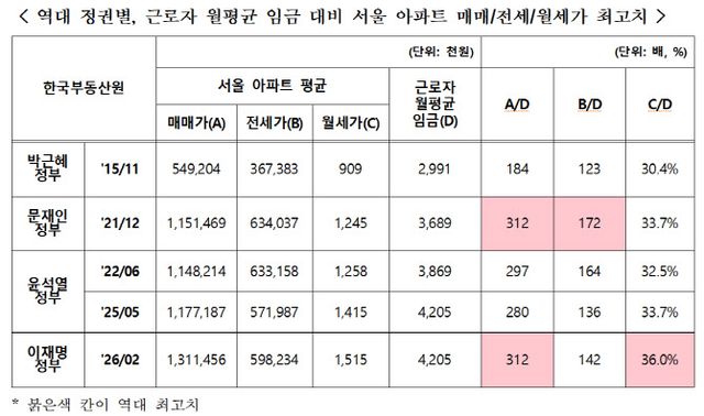 이 수치는 문재인 정부 시절이던 2021년 12월과 동일한 수준로 역대 최고치를 보였다. 당시 서울 아파트 평균 매매가격은 11억 5146만원, 월평균 근로자 임금은 368만 9000원으로 역시 312배를 기록한 바 있다.