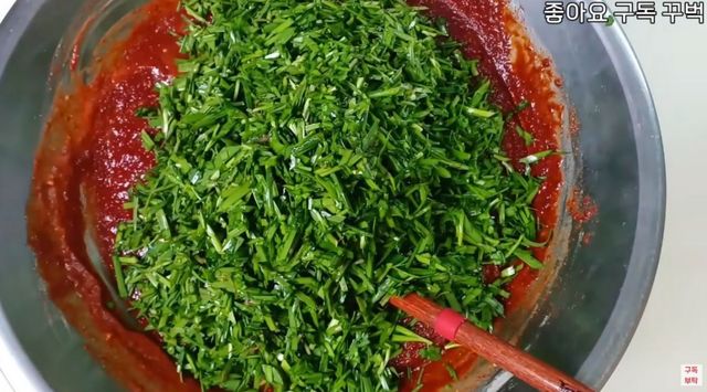 양념 베이스에 잘게 자른 부추를 넣은 모습. / 유튜브 '주부나라'