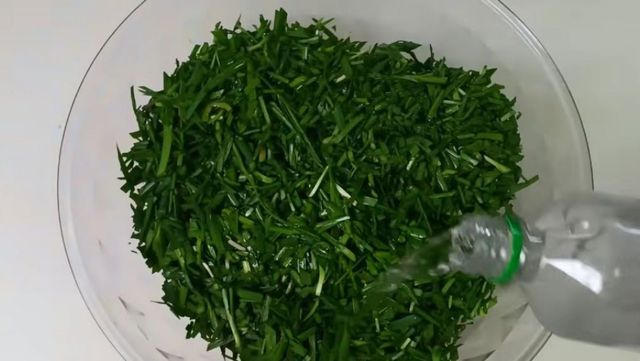 가장 먼저 할 일은 부추 500g을 흙이 나오지 않을 때까지 깨끗하게 씻는 것이다. 이때 세척 후 물기를 충분히 말리는 것이 장기 보관의 핵심이다. 부추를 손질할 때는 커터기를 쓰면 죽이 돼 풋내가 날 수 있으므로, 반드시 칼을 사용해 지뭉개지지 않도록 가늘고 잘게 썰어야 한다. 잘게 썬 부추에 소주 한 컵을 부어 골고루 섞어주면 부추가 상하지 않고 오래 보관할 수 있는 상태가 된다. 소주는 부추를 소독해 곰팡이가 피는 것을 막는 역할을 해 장기 보관을 가능케 한다.