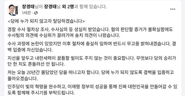 장경태 의원이 페이스북을 통해 더불어민주당 탈당을 선언했다. ⓒ 장경태 페이스북 캡처