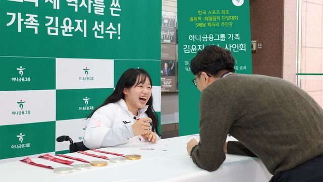 하나금융그룹은 지난 19일 서울 명동 사옥에서 김윤지 선수를 초청해 격려금을 전달하고 임직원과 함께하는 사인회를 진행했다고 밝혔다. 이번 행사는 대회에서 뛰어난 성과를 거둔 김윤지 선수의 노력을 기리고 향후 활약을 응원하기 위해 마련됐다.
