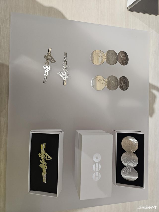 숄더 백은 고급 소재 위에 성덕대왕신종 문양을 정교한 자수로 구현해 눈길을 끌었다. 단순히 전통 문양을 얹는 수준이 아니라, 현대적 디자인 언어 안으로 자연스럽게 끌어들였다는 점이 특징적이다. 레이어드 스커트 역시 은은하게 비치는 소재와 섬세한 디테일로 한국적인 선의 미감을 살렸다. 헤어 클립은 앨범 로고를 형상화한 디자인으로 포인트를 줬고, 헤어 핀은 유려한 곡선의 한국적 실루엣과 모던한 소재가 만나 절제된 인상을 만들었다. 카드 홀더 또한 매끄러운 블랙 원단 위에 입체적인 디테일을 더해, 과하지 않으면서도 분명한 콘셉트를 드러냈다.
