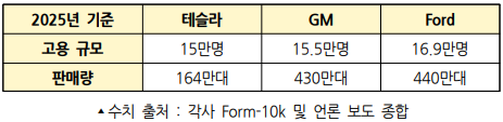 실제로 테슬라는 생산량 대비 가장 많은 자동화 설비를 갖춘 곳이기도 하지만, 반대로 생산량 대비 가장 많은 인간 노동자를 고용하고 있는 회사이기도 하다. 지엠(GM), 포드(Ford)와 비교하면 판매량 대비 고용 규모가 거의 2배에 달한다. 로봇이 인간 노동력을 대체할 것이라는 서사로 하루아침에 주가가 폭등하는 기업도 아니다.